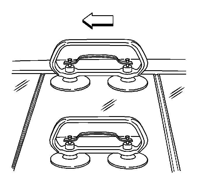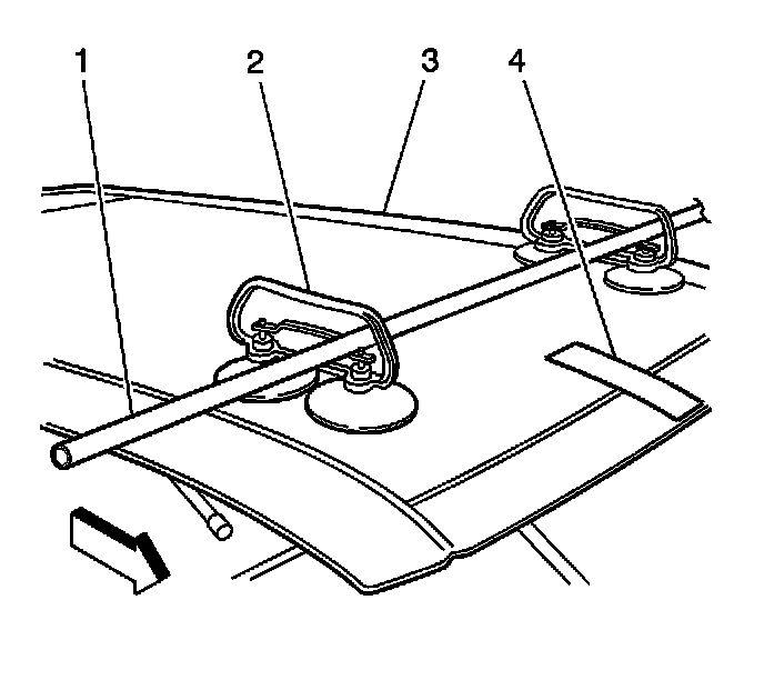 25. Carefully install three 25 mm (1 in) steel pipes, approximately 185 cm (6 ft) in length, through the suction cup handles in order to aid in the lifting and loading of the sunroof onto the body structure.