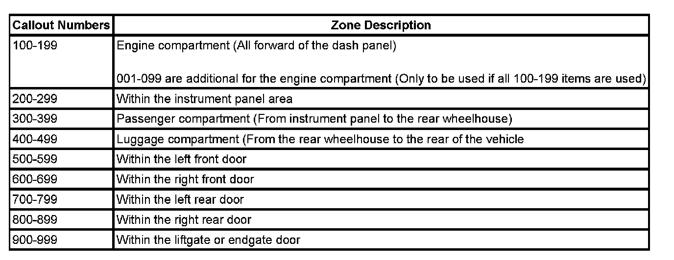 All grounds, in-line connectors, pass-through grommets, and splices have identifying numbers that correspond to where they are located in the vehicle. The table explains the numbering system.