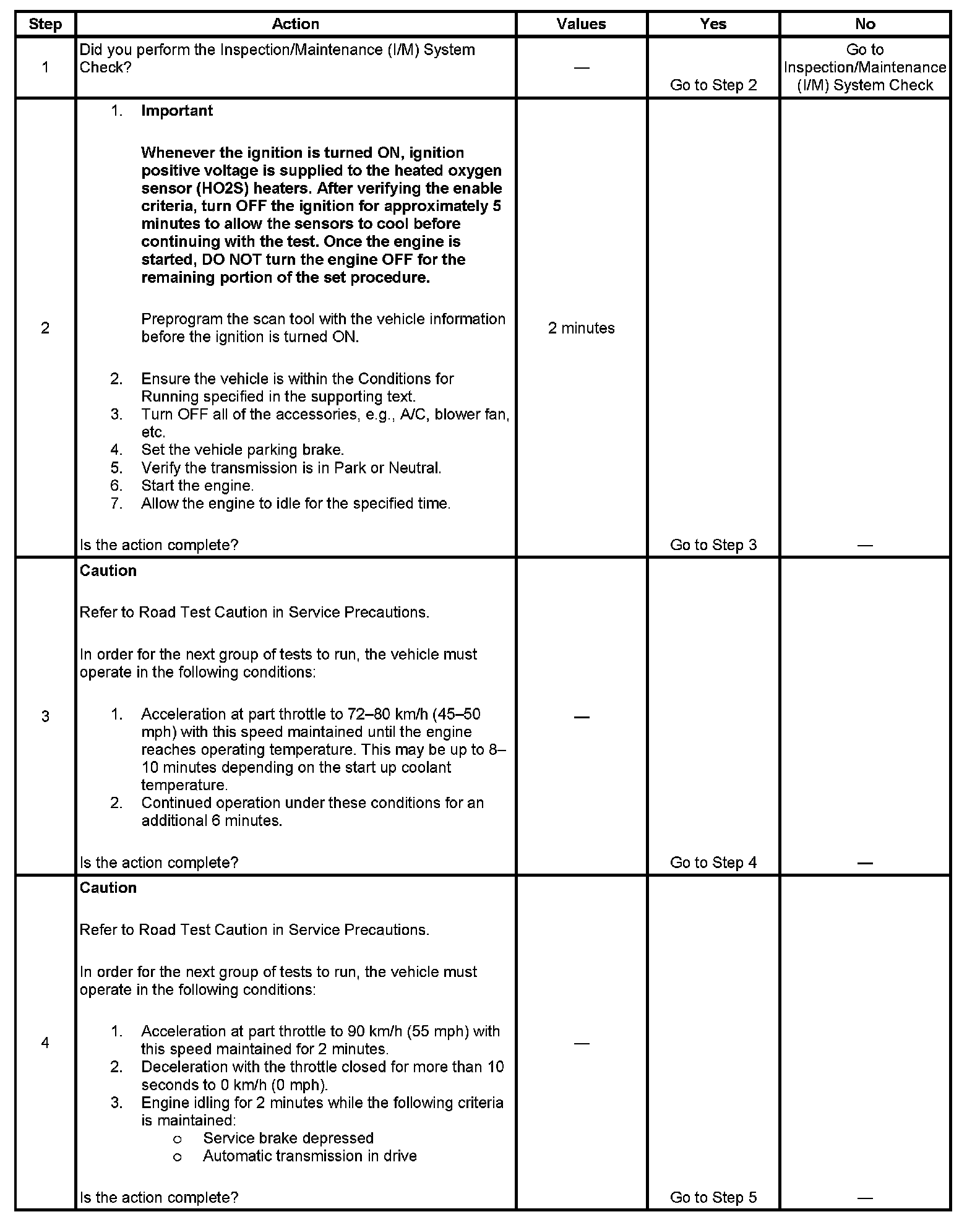 The scan tool can be used to monitor each of the I/M System Status indicators during the I/M Complete System Set Procedure. When all of the indicators for a test step have updated to YES, testing can move on to the next step even if the remaining portion of the test is not complete. For example, step 3 is designed to run the catalyst and HO2S tests. The procedure instructs the technician to operate the vehicle in the enable conditions for 8-10 minutes. If both tests have updated to YES within 4 minutes, it is not necessary to continue with the enable conditions and testing can advance to the next step.