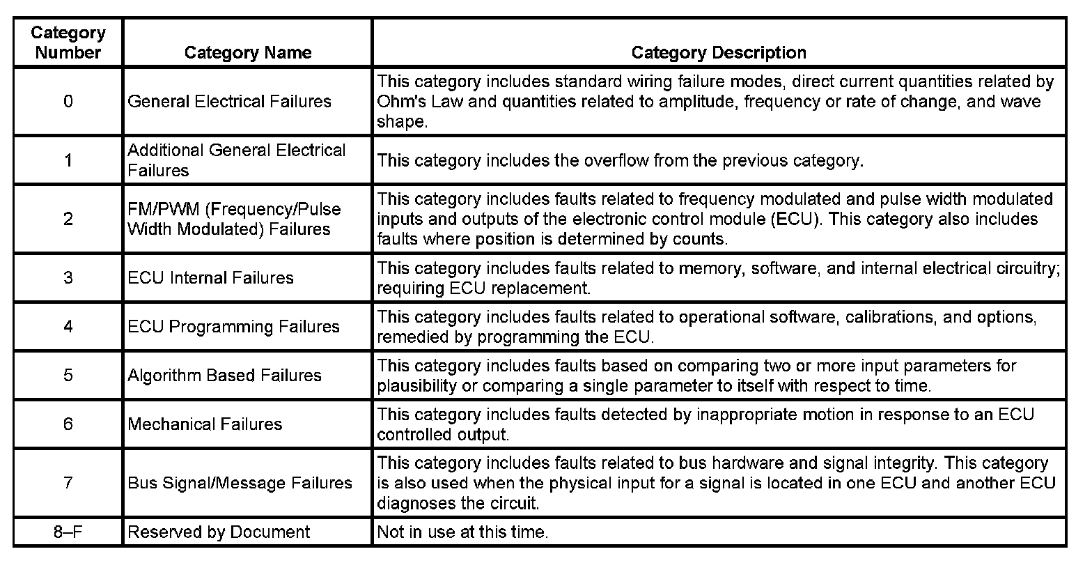 The DTC symptom is made up of 2 alphanumeric digits. The first digit DTC indicates the DTC symptom category. There are 16 possible categories available in the range of 0 through the letter F. Currently there are 8 categories in use, 0 through 7. These 8 categories together with their definitions are given.