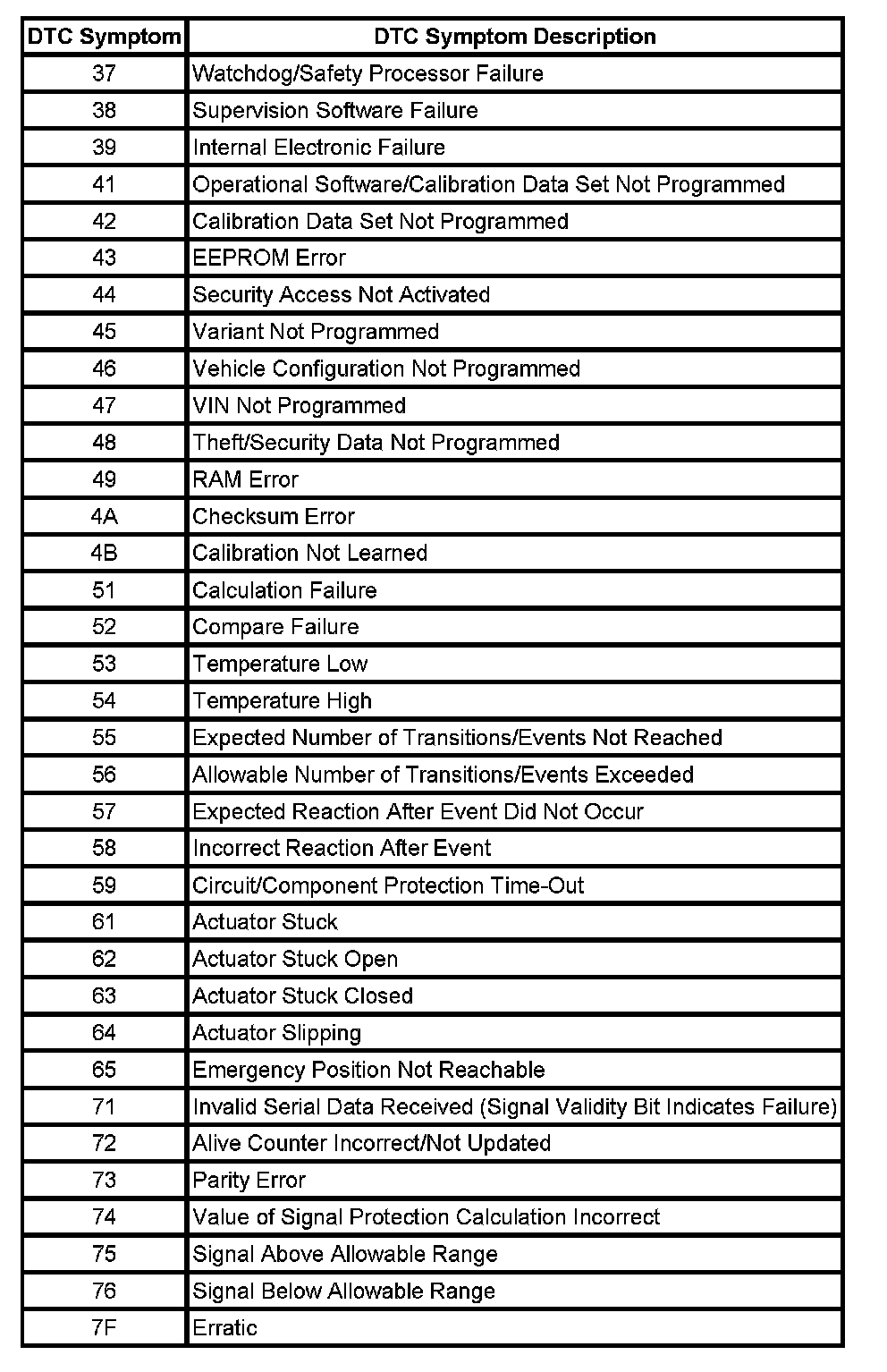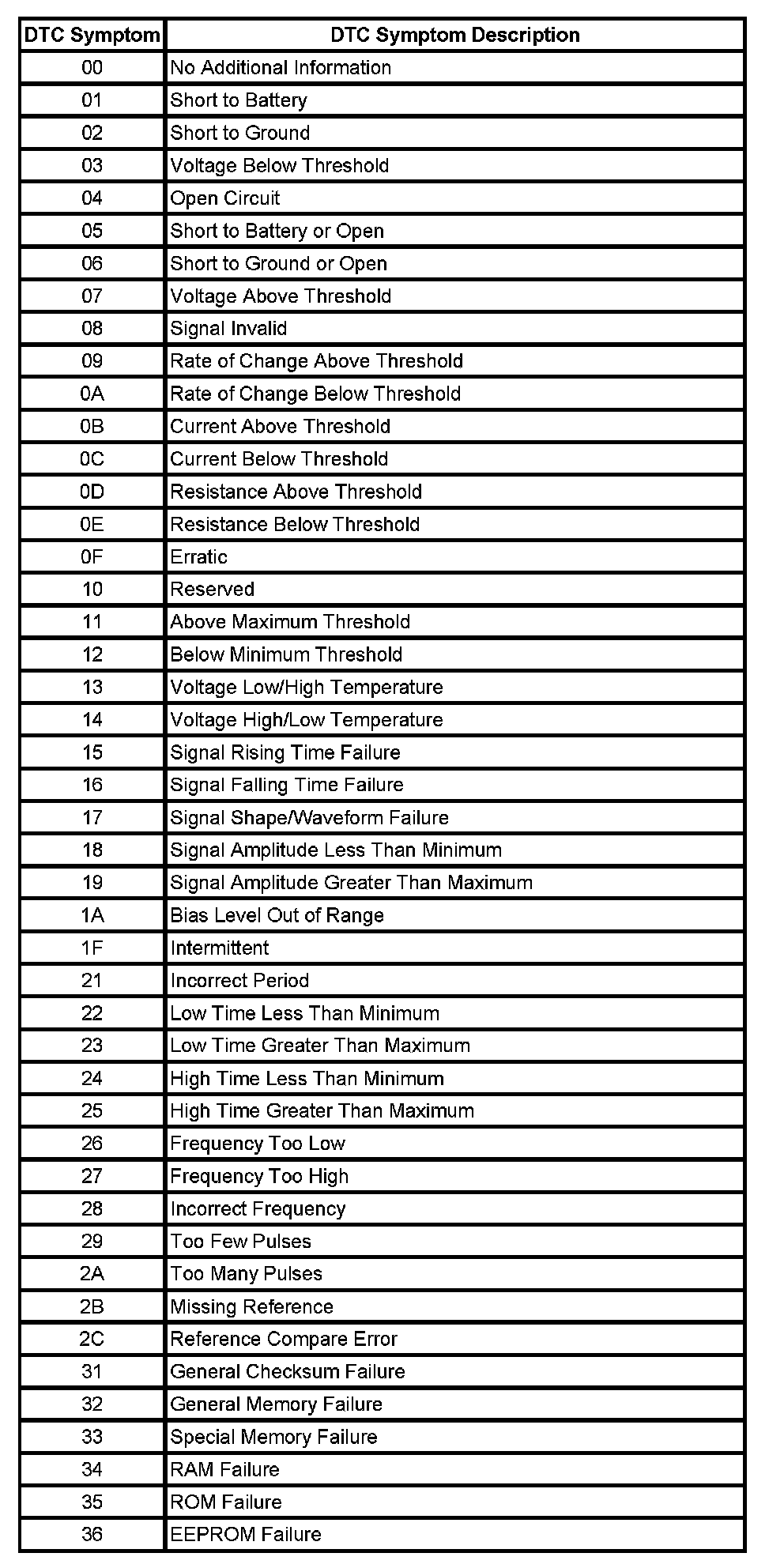A DTC symptom is a 2-digit number which adds additional detail to a DTC. The DTC symptom provides additional information without requiring a large increase in the number of new DTCs.