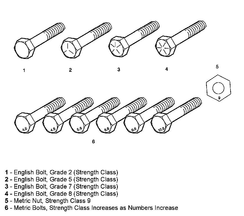 The most commonly used metric fastener strength property classes are 9.8 and 10.9. The class identification is embossed on the head of each bolt. The English, inch strength classes range from grade 2 to grade 8. Radial lines are embossed on the head of each bolt in order to identify the strength class. The number of lines on the head of the bolt is 2 lines less than the actual grade. For example, a grade 8 bolt will have 6 radial lines on the bolt head. Some metric nuts are marked with a single digit strength identification number on the nut face.