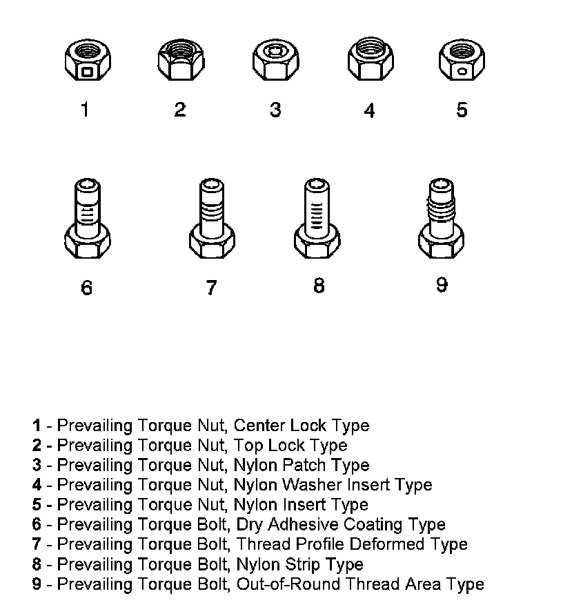 These fasteners accomplish the thread interface by the presence of a thread-locking compound on the fastener threads. Refer to the appropriate repair procedure in order to determine if the fastener may be reused and the applicable thread-locking compound to apply to the fastener.