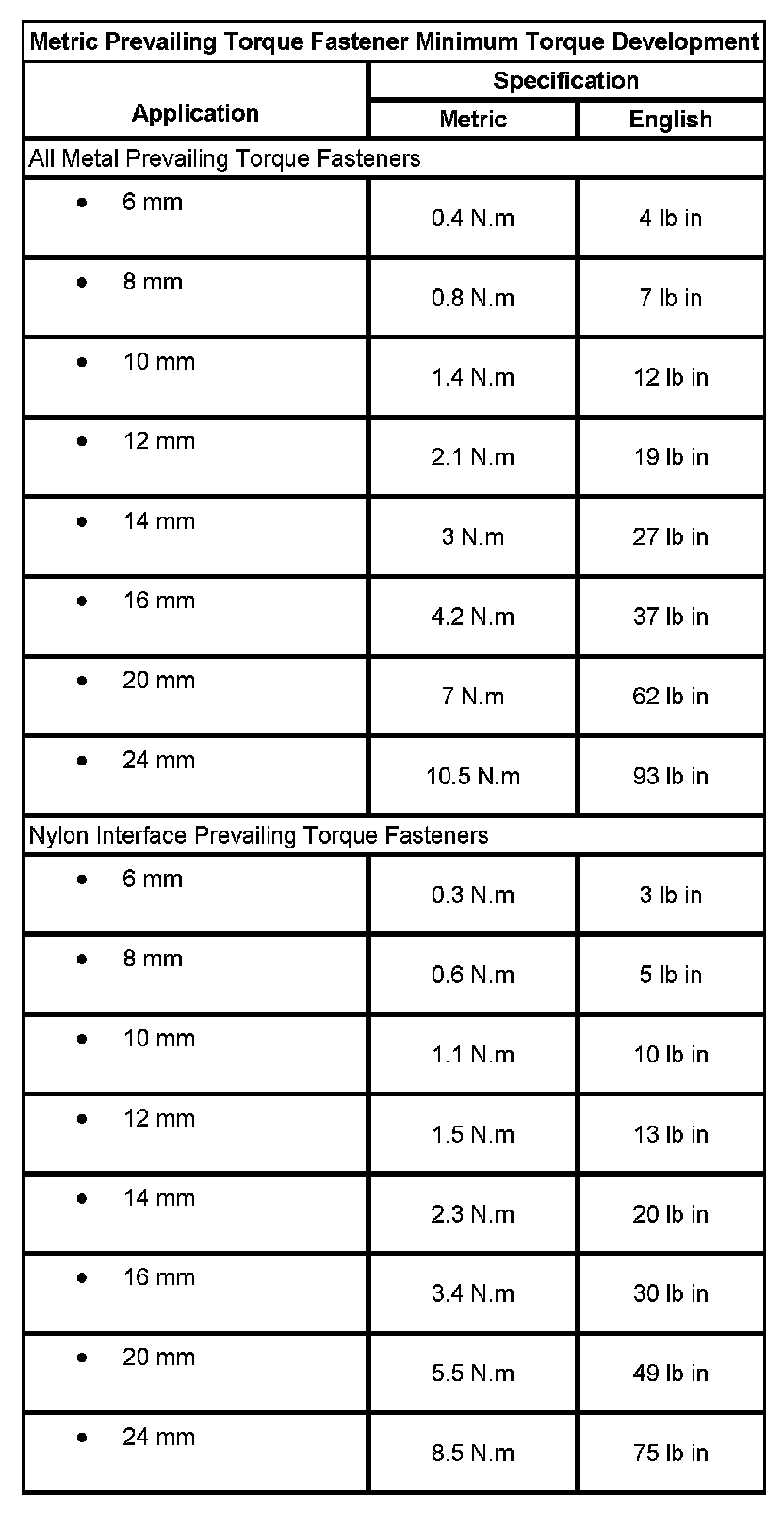 Metric Prevailing Torque Fastener Minimum Torque Development: