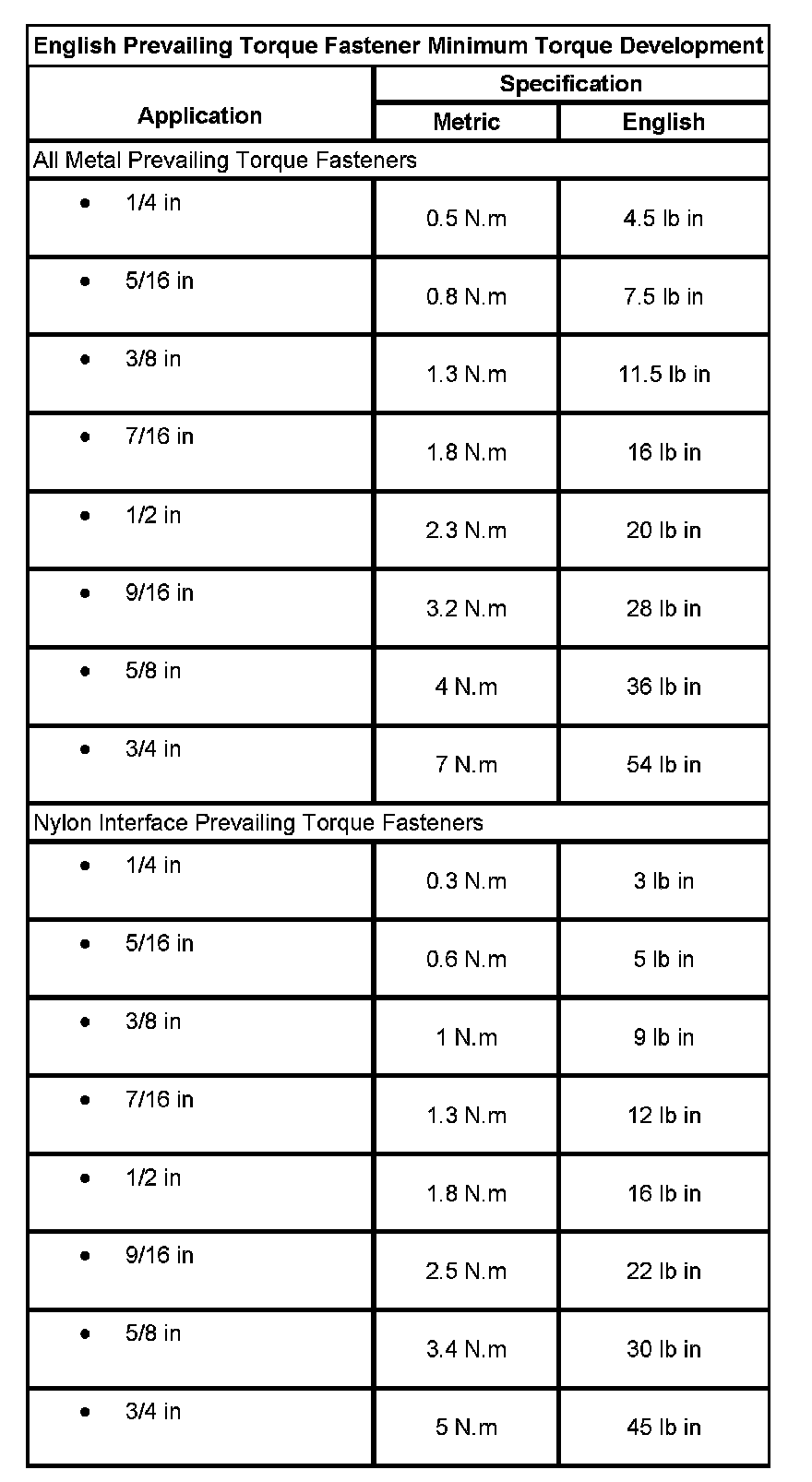 ENGLISH PREVAILING TORQUE FASTENER MINIMUM TORQUE DEVELOPMENT