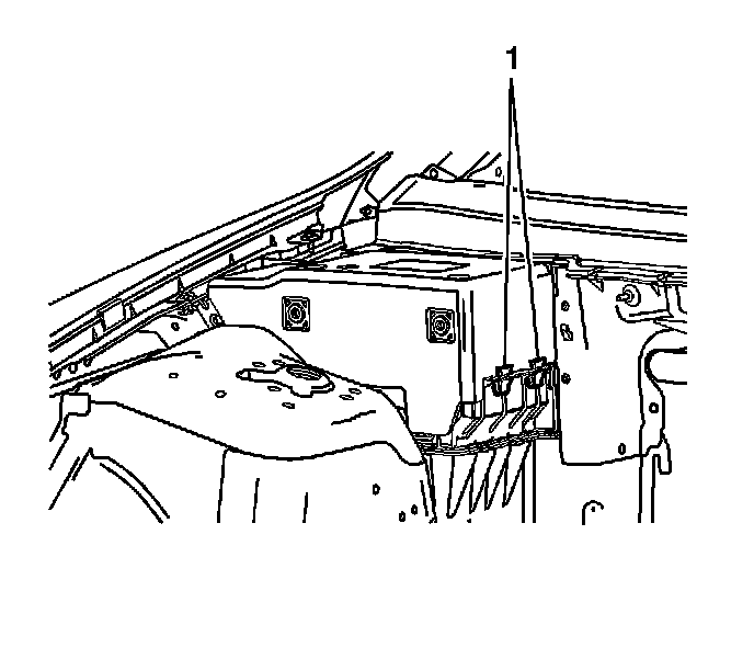 4. Depress the locking tabs (1) on the side of the battery heat shield.