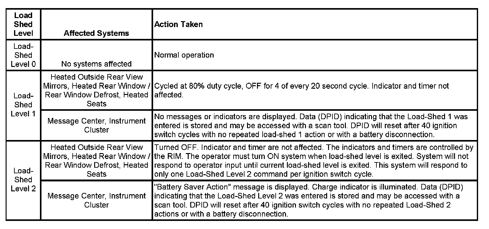 When the EPM algorithm is running, the DIM calculates the net charge rate on the electrical system by making constant voltage measurements. It uses the measurements to calculate the charge rate in amp/hours. If the DIM detects a negative charge rate, equal to a discharge from the battery, EPM can request up to 3 levels of idle boost from the ECM, when the vehicle is in park or neutral, as well as up to 2 levels of load shedding for a total of 5 levels of corrective action to maintain proper vehicle electrical system operation.