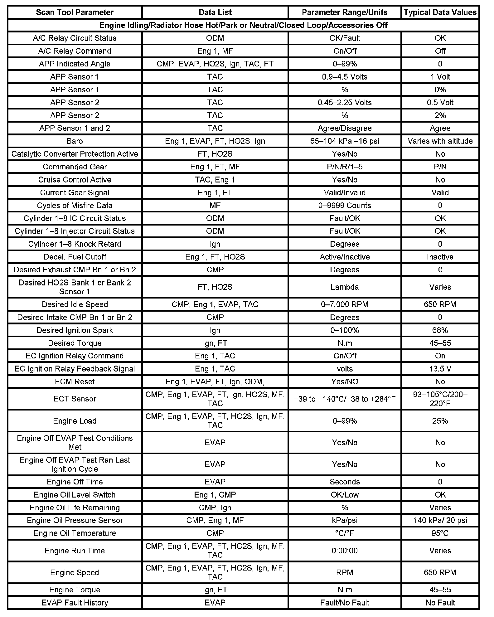 The Engine Scan Tool Data List contains all engine related parameters that are available on the scan tool. The list is arranged in alphabetical order. A parameter may appear in any one of the data lists, and in some cases may appear more than once, or in more than one data list in order to group certain related parameters together.