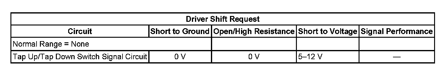 The TCM detects an invalid voltage on the TAP Up/Down Signal Circuit for 5 seconds.