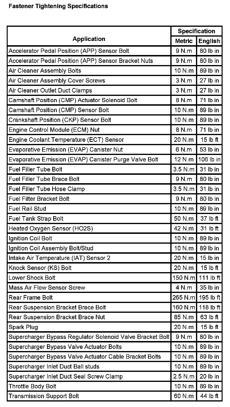 Fastener Tightening Specifications: