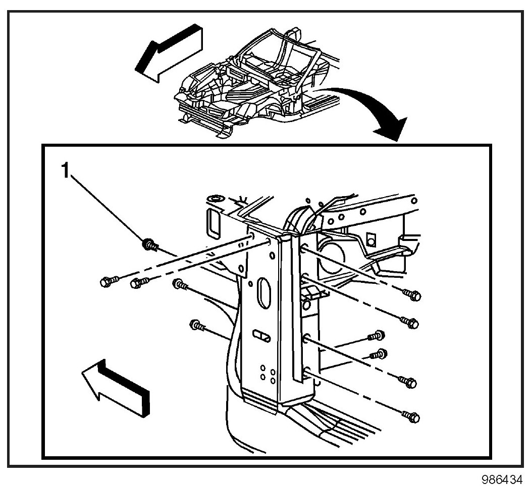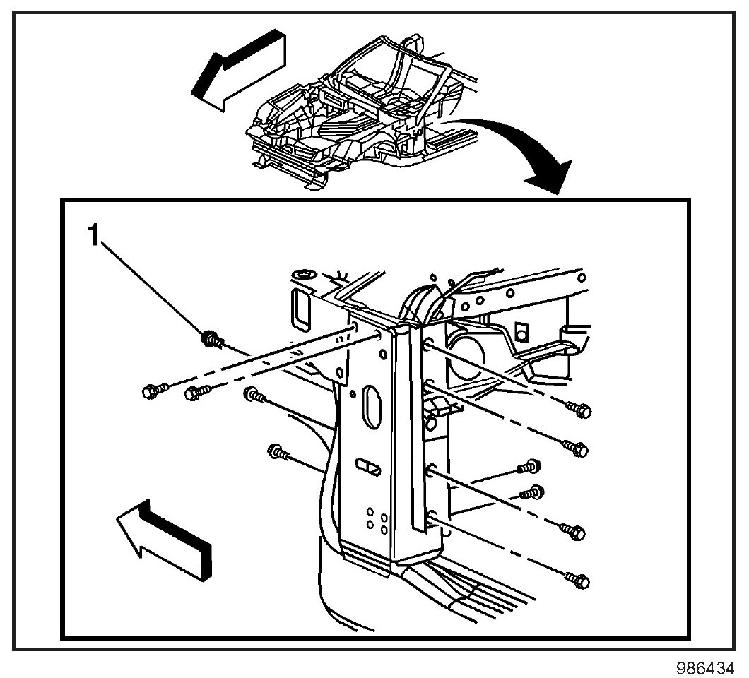 5. Install the bolts (1) that attach the windshield frame to the front hinge pillar.