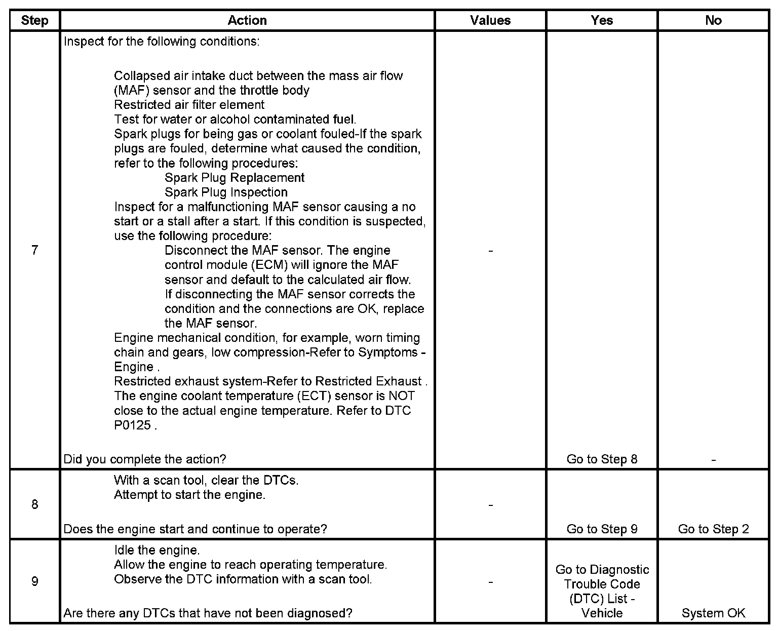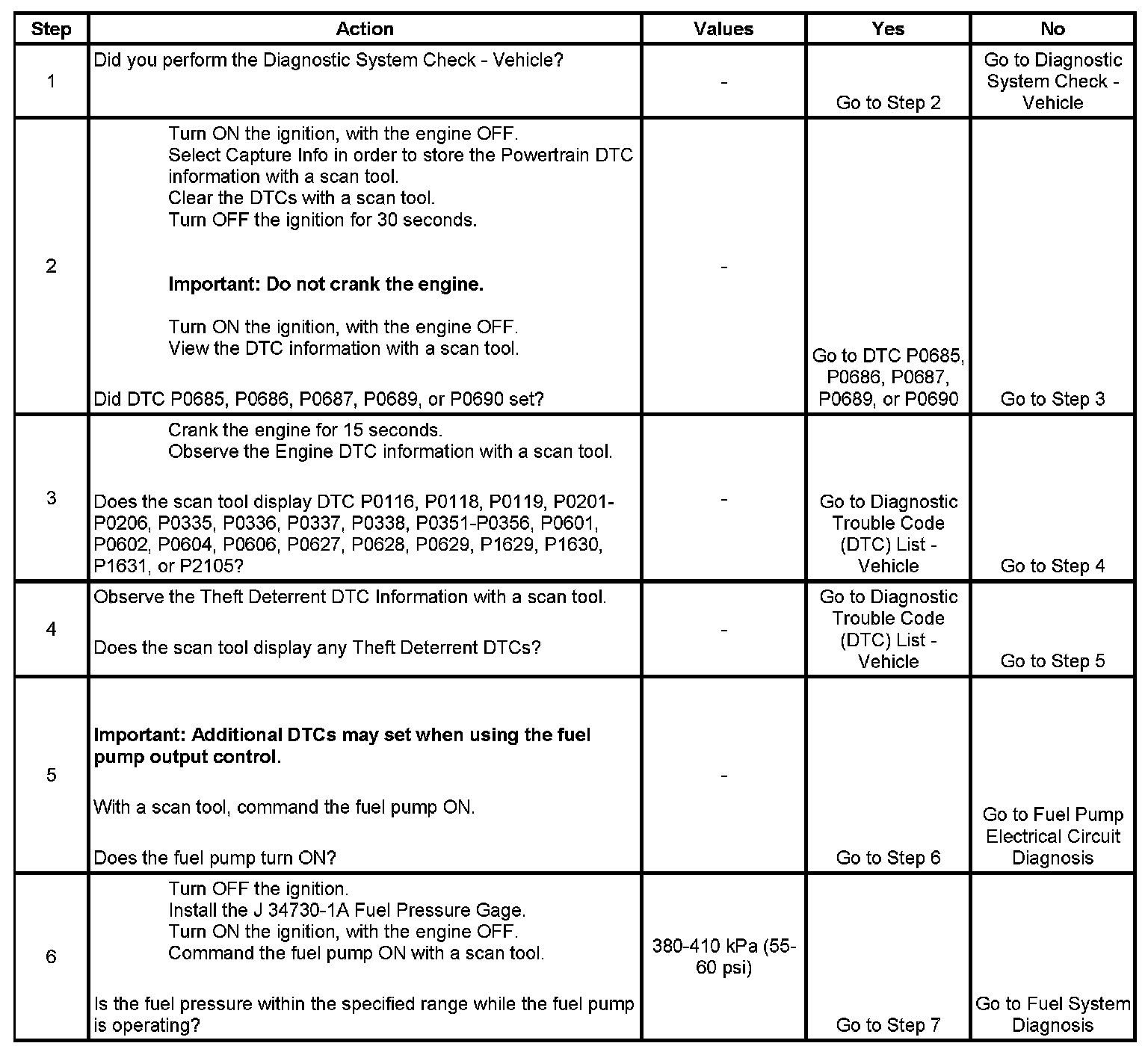 The Engine Cranks but Does Not Run diagnostic table is an organized approach to identifying a condition that causes an engine not to start. The Engine Cranks but Does Not Run diagnostic table directs the service technician to the appropriate system diagnosis.