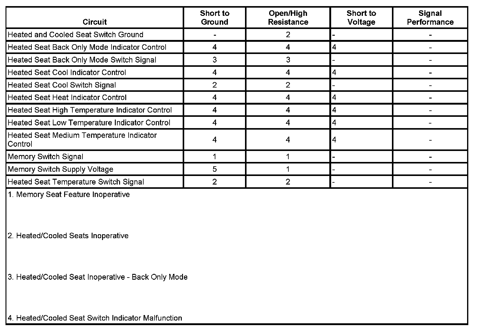 Battery positive voltage is supplied to the memory function switch from the driver door module (DDM). When a memory switch is pressed, battery voltage is applied through the switch contacts, a series of resistors, and thorough the memory switch signal circuit to the DDM. The door control module then sends a message via the GMLAN serial data line to the memory seat module (MSM) indicating the memory recall request. The MSM then commands the appropriate seat motors to move to the pre-recorded seat positions stored in memory in response to the switch input.