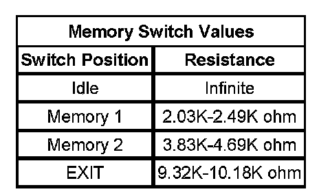 3. Test the resistance between terminals 14 and 5. Press the memory 1, memory 2, and EXIT buttons and compare the resistance readings to the values in the Memory Switch Values table below.