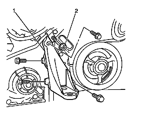 6. Remove the power steering pressure hose bracket retaining nut (2) at the cylinder head.