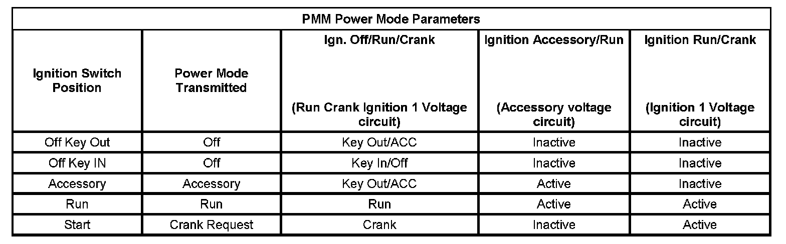 The PMM receives ignition switch signals to identify the operators desired power mode. The PMM Power Mode Parameters table below illustrates the correct state of these input parameters (circuits) in correspondence to the ignition switch position: