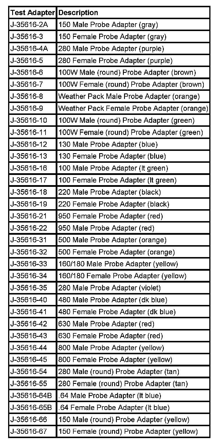 Notice: Do not insert test equipment probes (DVOM etc.) into any connector or fuse block terminal. The diameter of the test probes will deform most terminals. A deformed terminal will cause a poor connection, which will result in a system failure. Always use the J-35616 GM-Approved Terminal Test Kit in order to front probe terminals. Do not use paper clips or other substitutes to probe terminals.