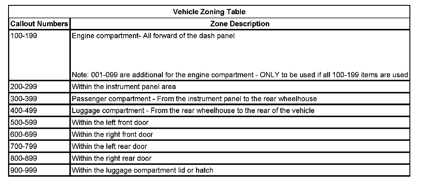 All grounds, in-line connectors, pass-through grommets, and splices have identifying numbers that correspond to where they are located in the vehicle. The table explains the numbering system.