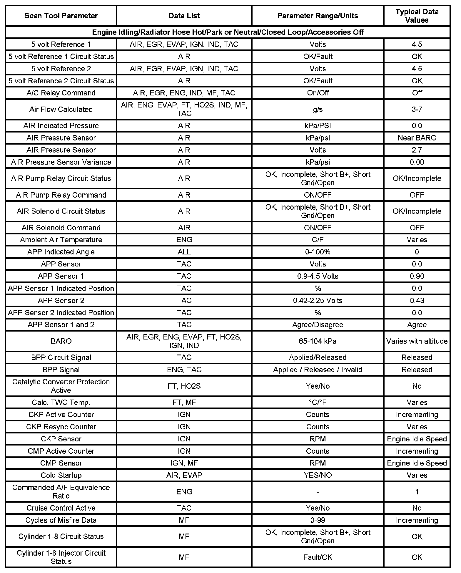 Scan tool values from a properly running engine may be used for comparison with the engine you are diagnosing. The Engine Scan Tool Data List represents the values that would be seen on a normal running engine.