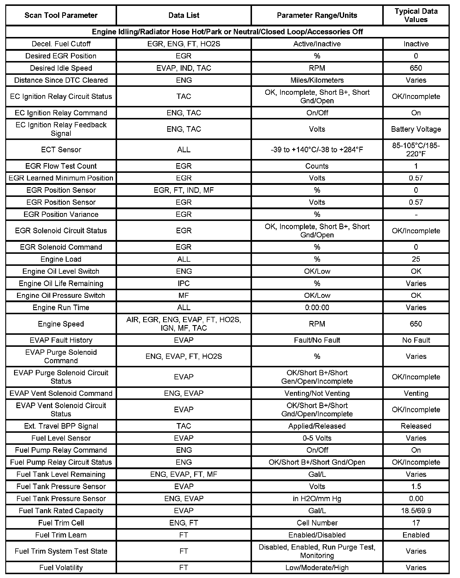 The Engine Scan Tool Data List contains all engine related parameters that are available on the scan tool. The list is arranged in alphabetical order. A parameter may appear in any one of the data lists, and in some cases may appear more than once, or in more than one data list in order to group certain related parameters together.