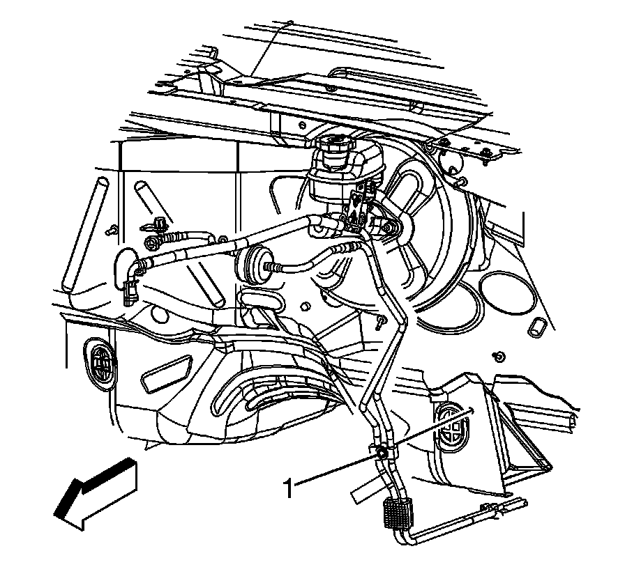 8. Disconnect the chassis EVAP line quick connect fitting (1) from the EVAP canister.