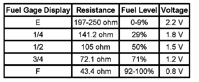 The information in this table is intended for use with the J 33431-C Signal Generator and Instrument Panel Tester. The fuel level sensor values represent the test values to be used on the Signal Generator to drive the fuel gage display to the indicated positions. Vehicles that require more than one fuel level sensor calculate gage position from many possible resistance combinations of fuel levels between the two tanks. Therefore, the values in the table may not correlate directly to readings taken from the vehicle primary or secondary sending units.