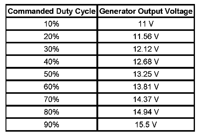 The engine control module (ECM) controls the generator through the generator field control circuit. It monitors the generator performance though the generator field duty cycle signal circuit. The ECM controls the generator through the generator field control circuit. The signal is a 5-volt pulse width modulation (PWM) signal of 128 Hz with a duty cycle of 0-100 percent. Normal duty cycle is between 5-95 percent. Between 0-5 percent and 95-100 percent are for diagnostic purposes. The following table shows the commanded duty cycle and output voltage of the generator: