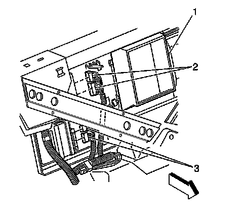 5. With the locking tabs (2) depressed, slide the ESC module (1) towards the center of the vehicle.