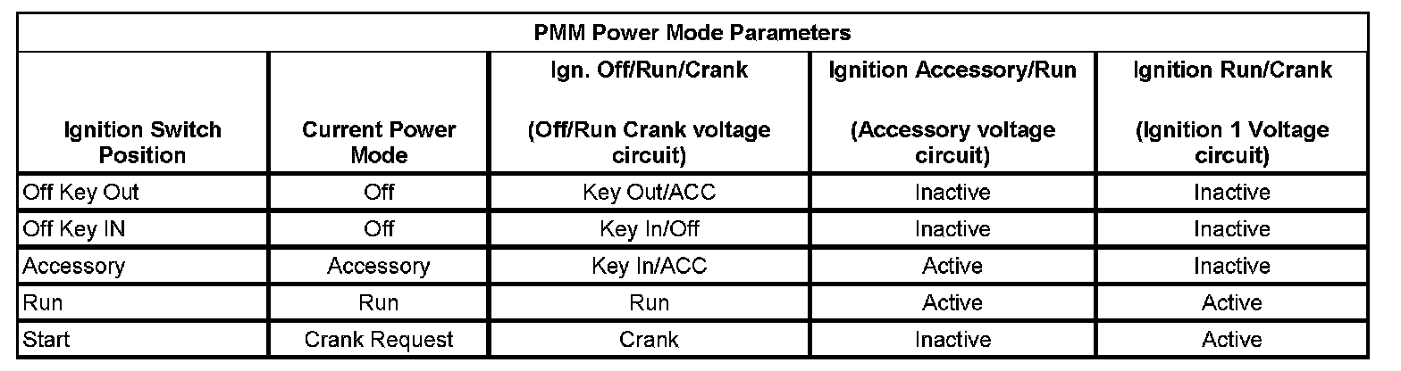 Verify that all the parameters listed in the following table correspond to the ignition key position. The PMM Power Mode parameters table below illustrates the correct state of these parameters (circuits) with the corresponding ignition switch positions. The circuits related to the parameters are in parenthesis.