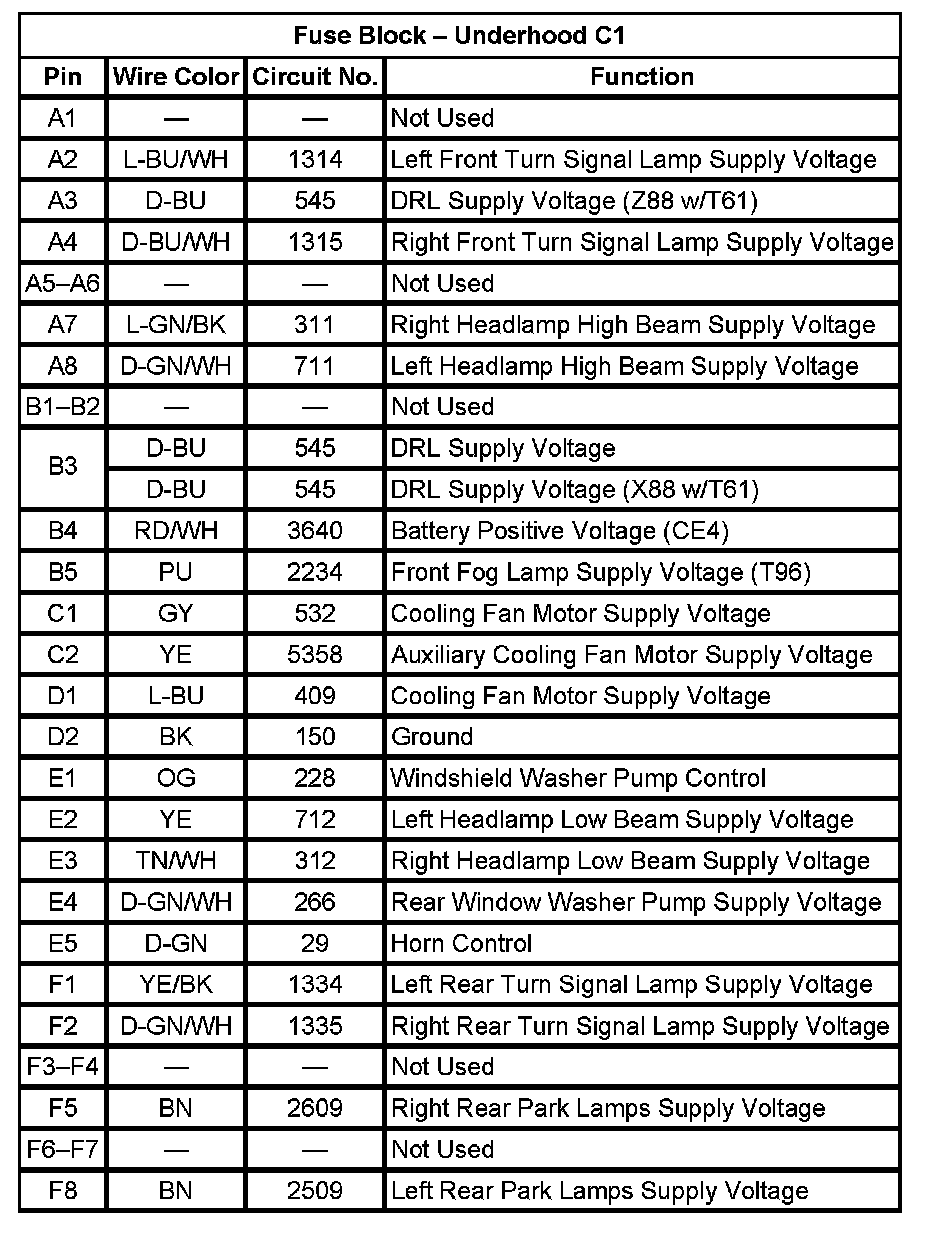 Fuse Block - Underhood C1 (Pin A1 To F8):