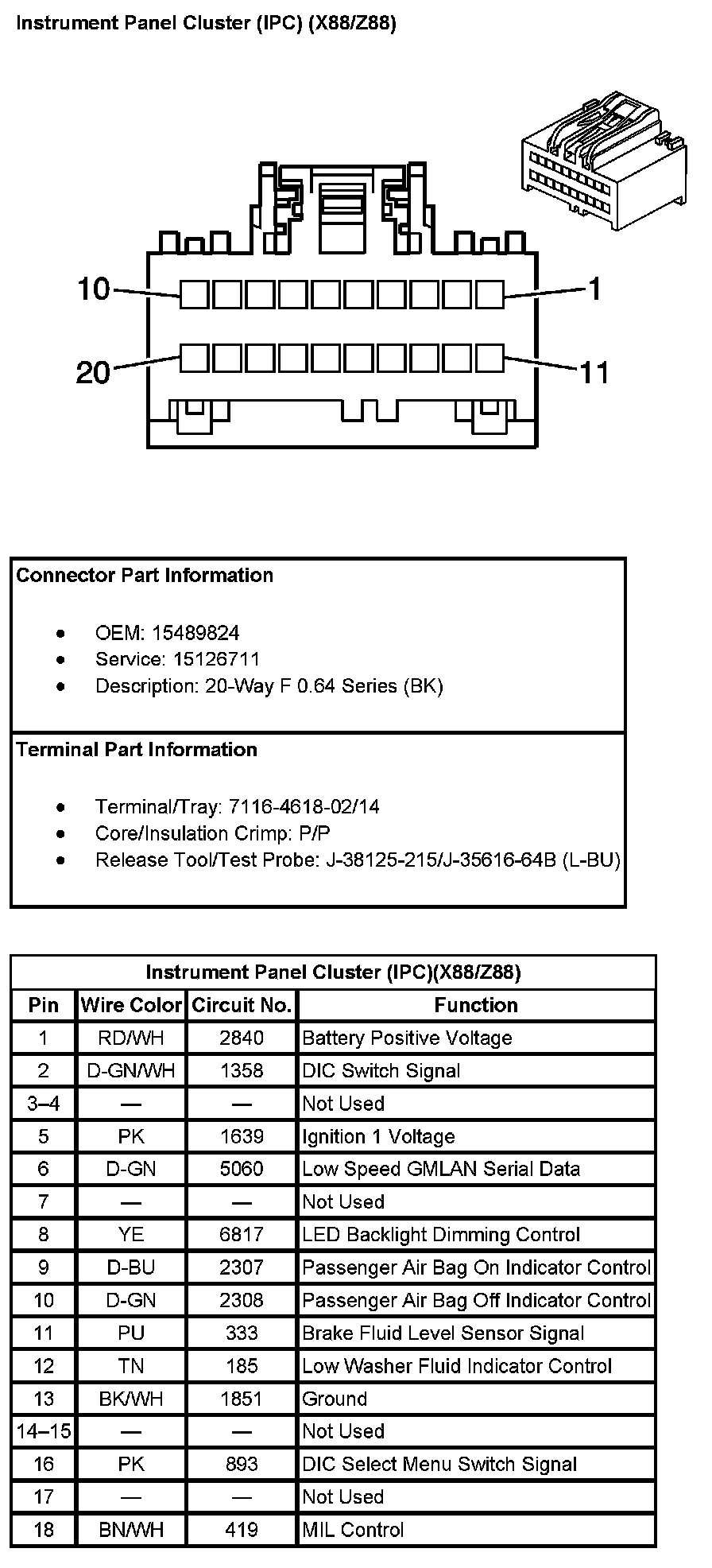 Instrument Panel Cluster (IPC) (With RPO Codes X88/Z88) (Pin 1 To 18):