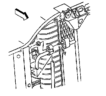 8. Install the tie bar to radiator brace bolts (1). Access the bolts from the rear of the upper radiator support.