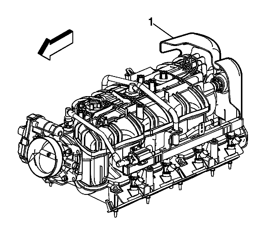 10. Locate the rear engine cover (1) on rear of intake manifold.