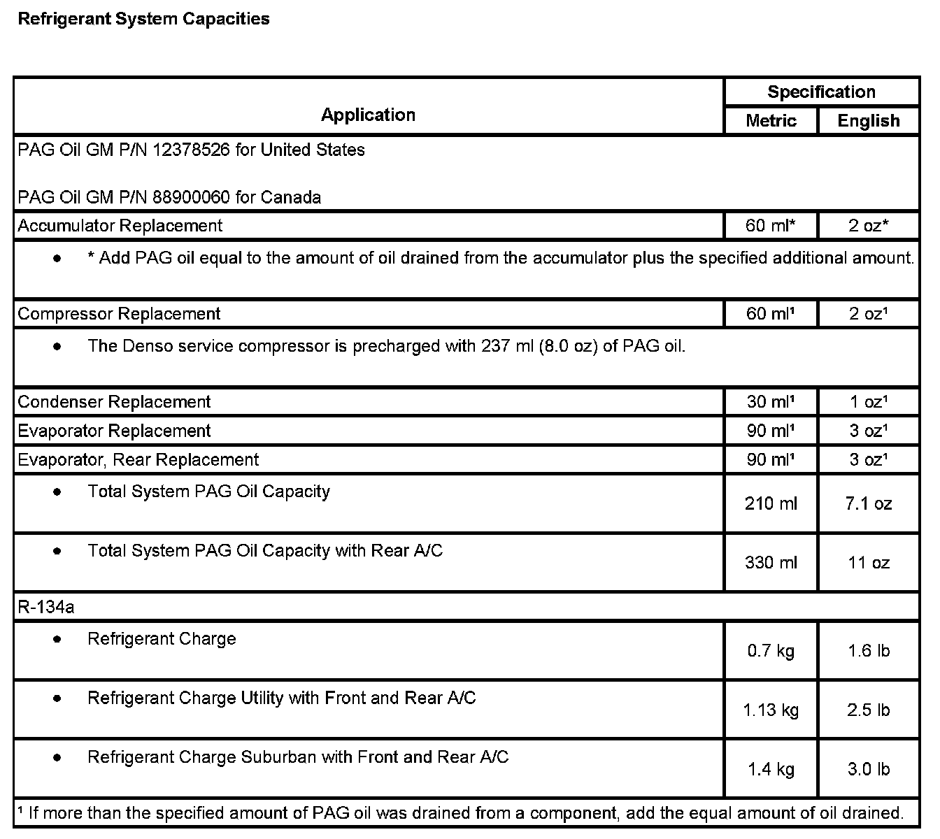 Refrigerant System Capacities: