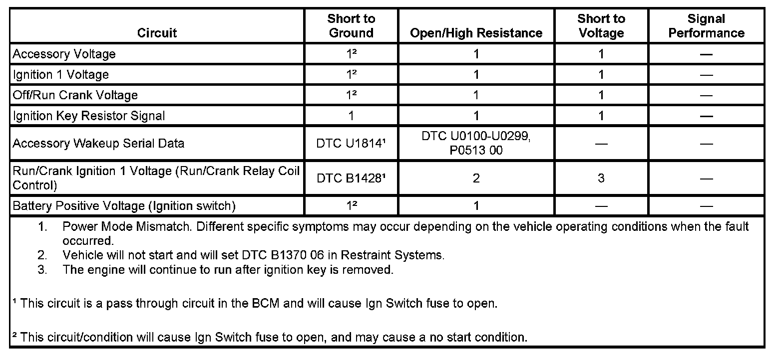 - A short to ground in the run/crank ignition 1 voltage circuit of the run crank relay will cause an open fuse to the ignition switch. DTC B1428 should be current.