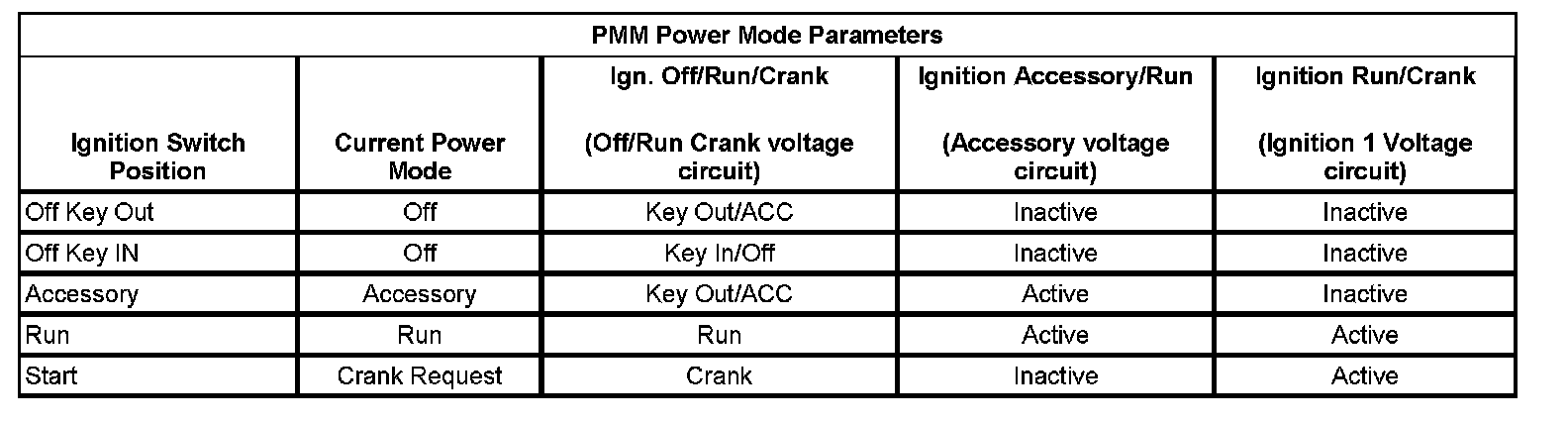 This vehicles power mode master (PMM) is the body control module (BCM). The ignition switch is a low current switch with multiple discrete ignition switch signals to the PMM for determination of the power mode. The PMM receives the ignition switch signals, and additionally a reference voltage signal from the BCM, through the ignition switch, and back to the BCM. There are redundancies within the PMM system that can allow operation of certain subsystems when there are faults in the ignition switch circuits. Other information such as serial data input from other modules and DTCs is also used to determine what power mode signals and information is transmitted by the PMM. The BCM logic uses all this information to identify the operators desired power mode and activate specific discrete signals, and serial data messages for the operation of many different subsystems as necessary. Other modules which have switched voltage inputs may operate in a default mode if the PMM serial data message does not match what the individual module can see from its own connections.
