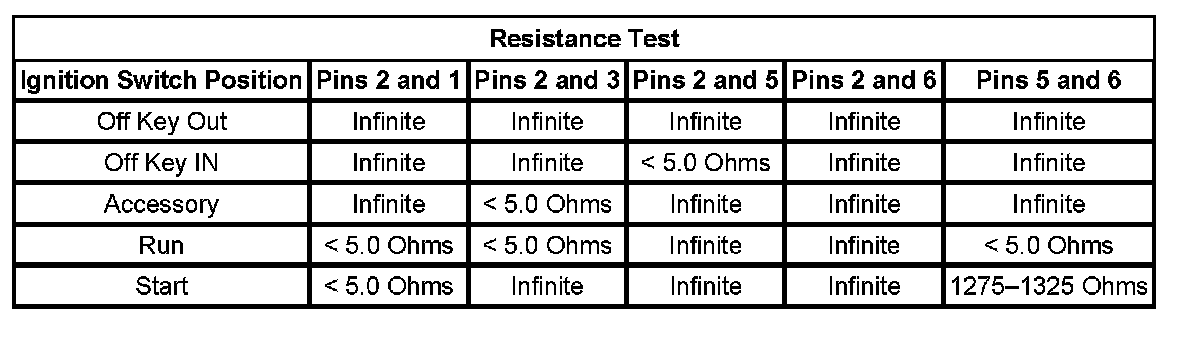 Using the Resistance Test above, check the resistance between the pins of the ignition switch listed in each switch position listed.