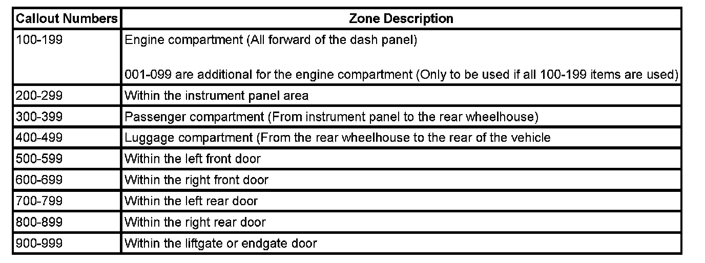 All grounds, in-line connectors, pass-through grommets, and splices have identifying numbers that correspond to where they are located in the vehicle. The table explains the numbering system.