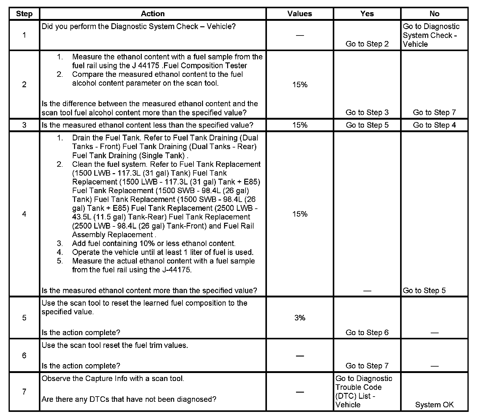 When an E85 compatible vehicle is built, an ECM or PCM replaced, or when the learned alcohol content has been reset with a scan tool the fuel system will need to contain ASTM gasoline with 10 percent or less ethanol content. If the fuel in the fuel system needs to be drained and replaced with ASTM gasoline, the engine will need to run at operating temperature and consume at least 1 liter of fuel before the system will recognize the correct alcohol content. Either ASTM gasoline or ASTM E85 fuel can then be used.