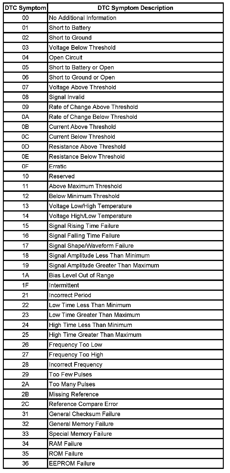 The DTC symptom is made up of 2 alphanumeric digits. The first digit following the DTC indicates the DTC symptom category. There are 16 possible categories available in the range of 0 through the letter F. Currently there are 8 categories in use, 0 through 7. These 8 categories together with their definitions are given.
