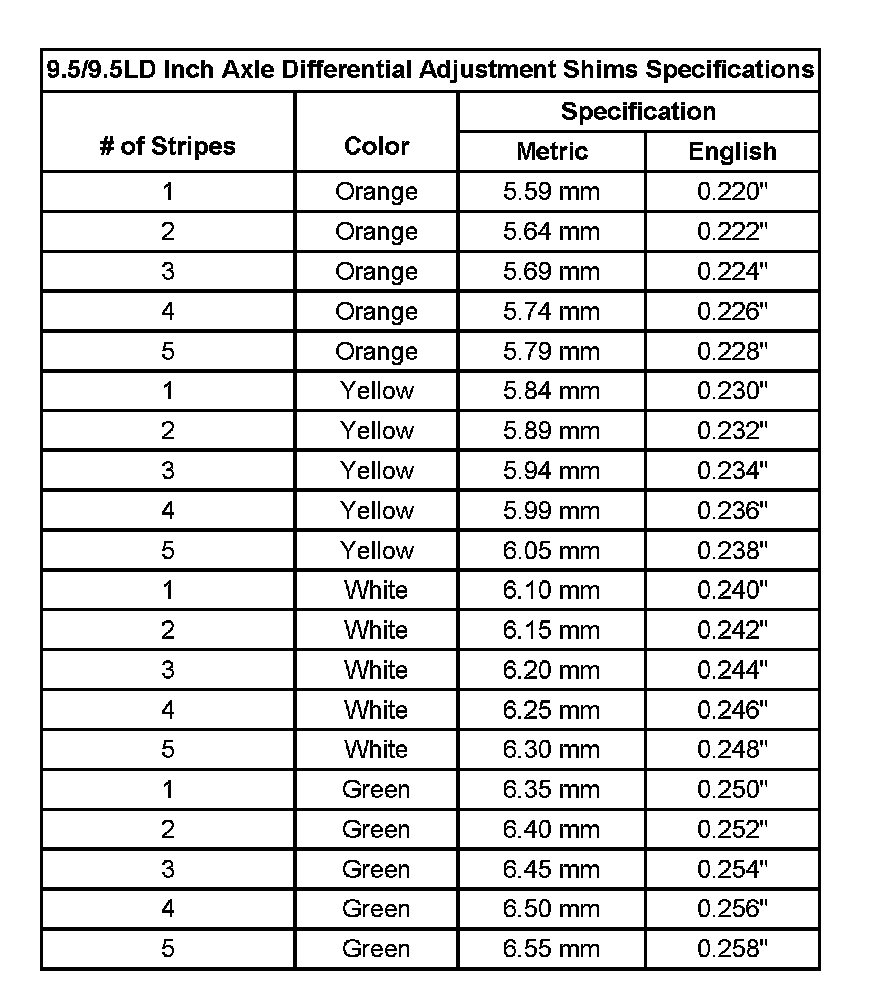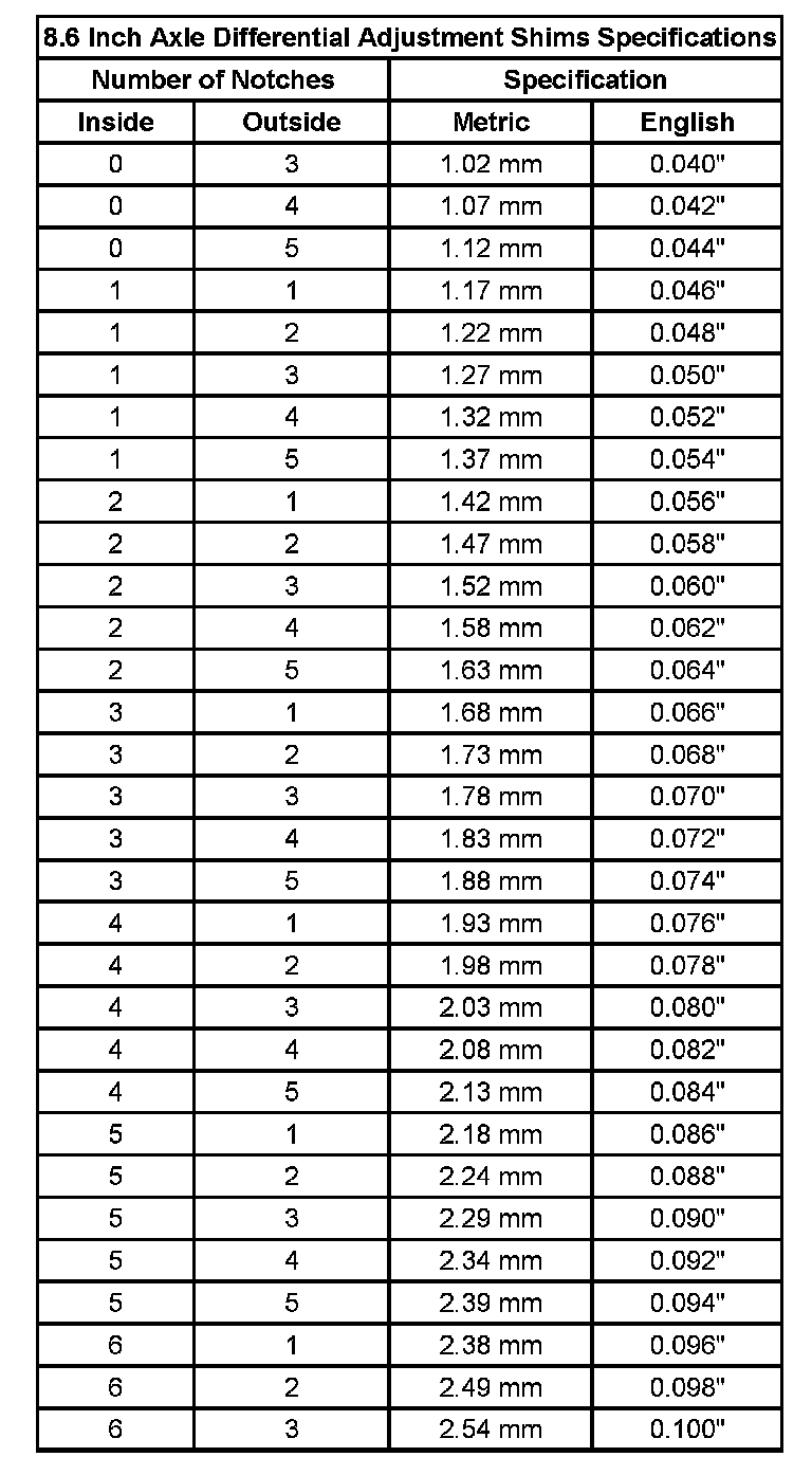 8.6 Inch Axle Differential Adjustment Shim Specifications: