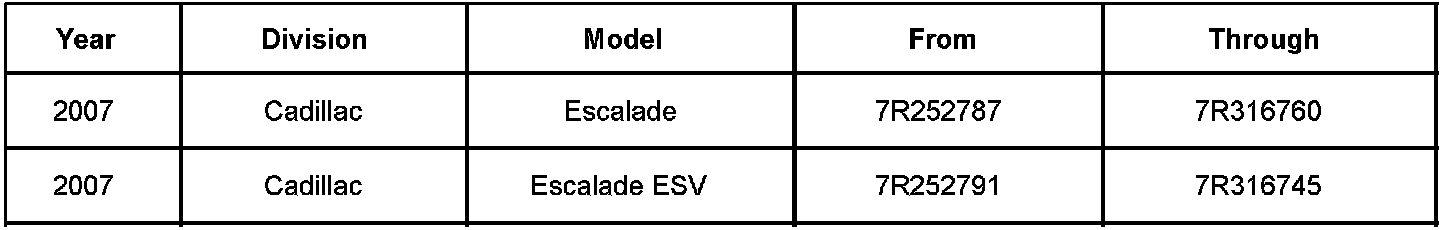 Involved are certain 2007 Cadillac Escalade and Escalade ESV vehicles equipped with the three round LED Universal Home Remote System and built within the VIN breakpoints shown.