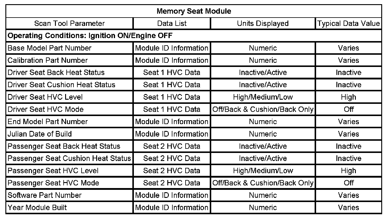 The scan tool data list contains all the heated seat system related parameters that are available on the scan tool. The parameters in the list are arranged in alphabetical order. The column, Data List, indicates the location of the parameter within the scan tool menu selections.
