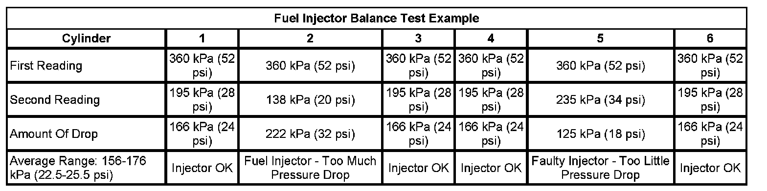 7. Add all of the individual pressure drop values in order to calculate the total pressure drop. Divide the total pressure drop by the number of fuel injectors in order to calculate the average pressure drop. The difference between any individual pressure drop and the average pressure drop should not be more than 20 kPa (3 psi).