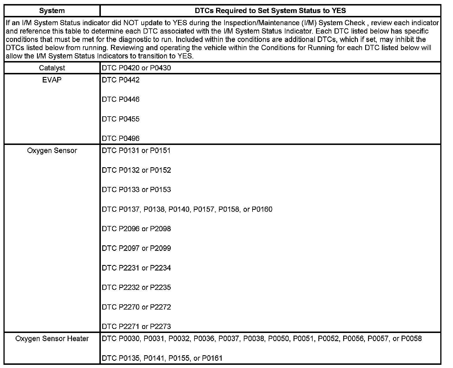 Inspection/Maintenance (I/M) System DTC Table
