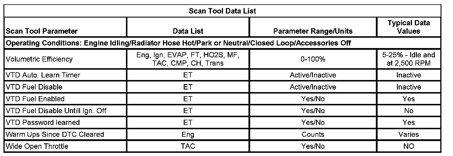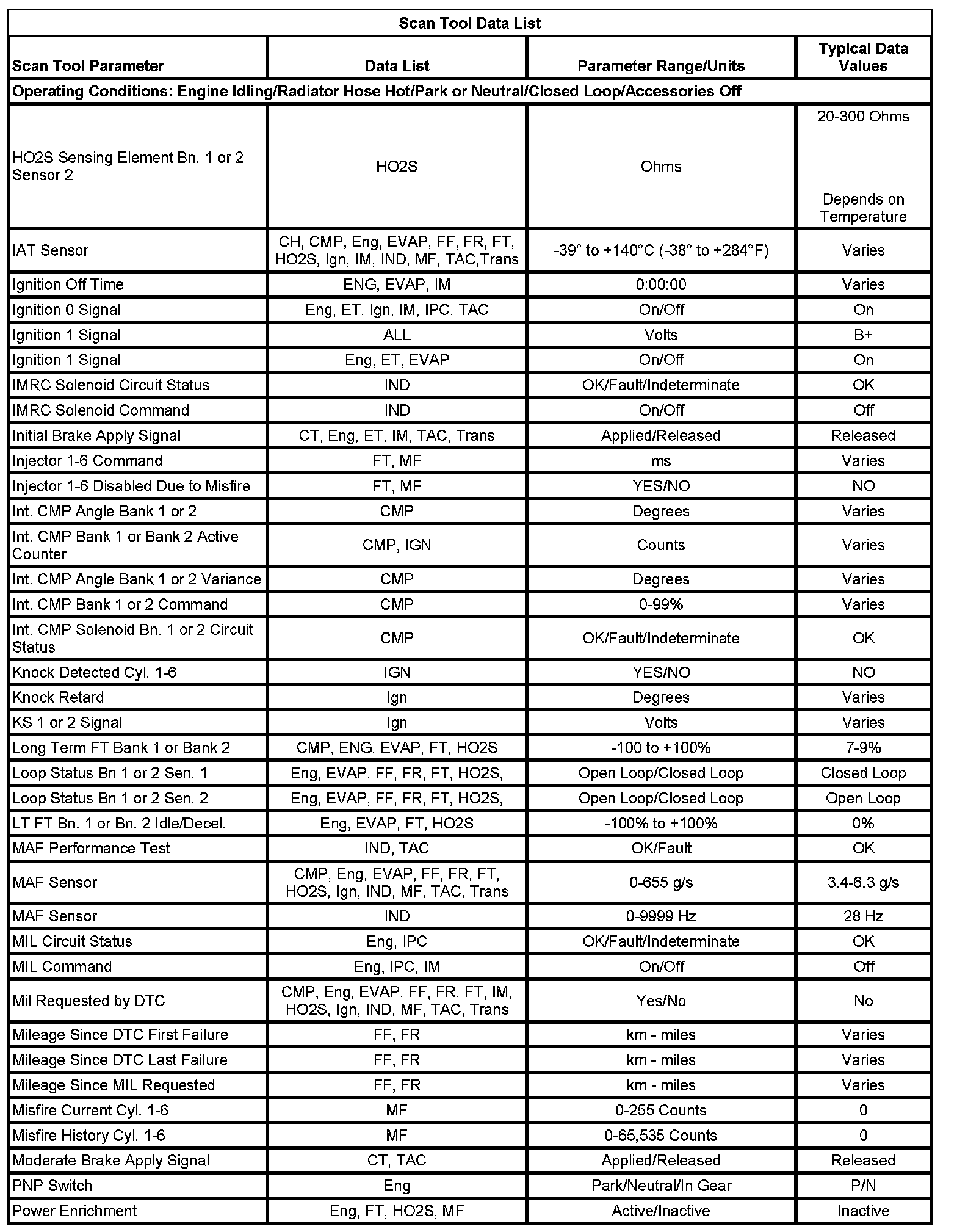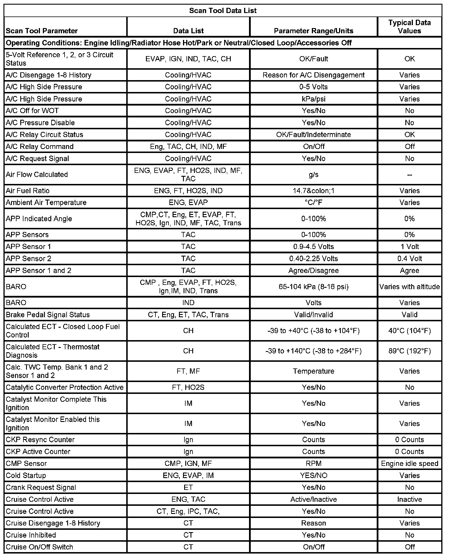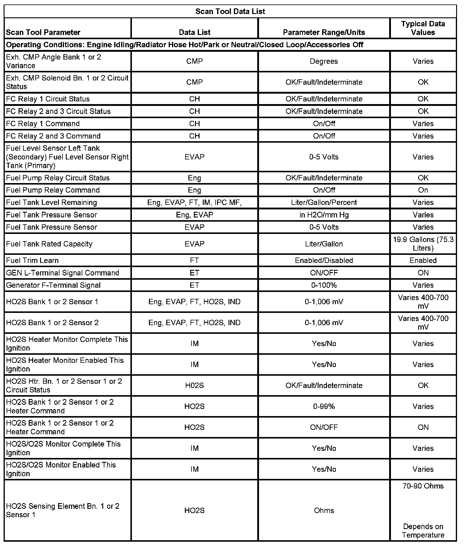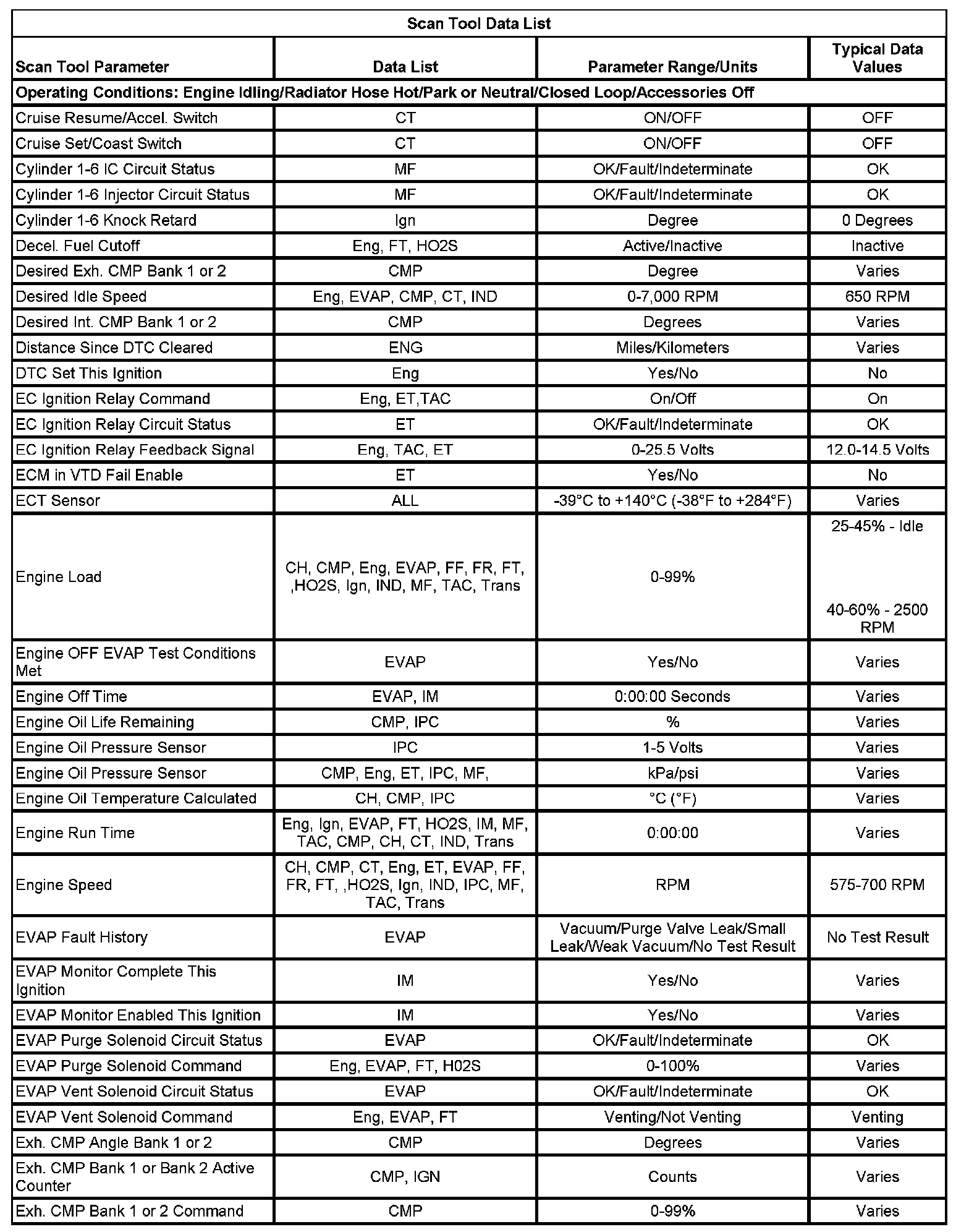 The Engine Scan Tool Data List contains all engine related parameters that are available on the scan tool. The list is arranged in alphabetical order. A parameter may appear in any one of the data lists, and in some cases may appear more than once, or in more than one data list in order to group certain related parameters together.