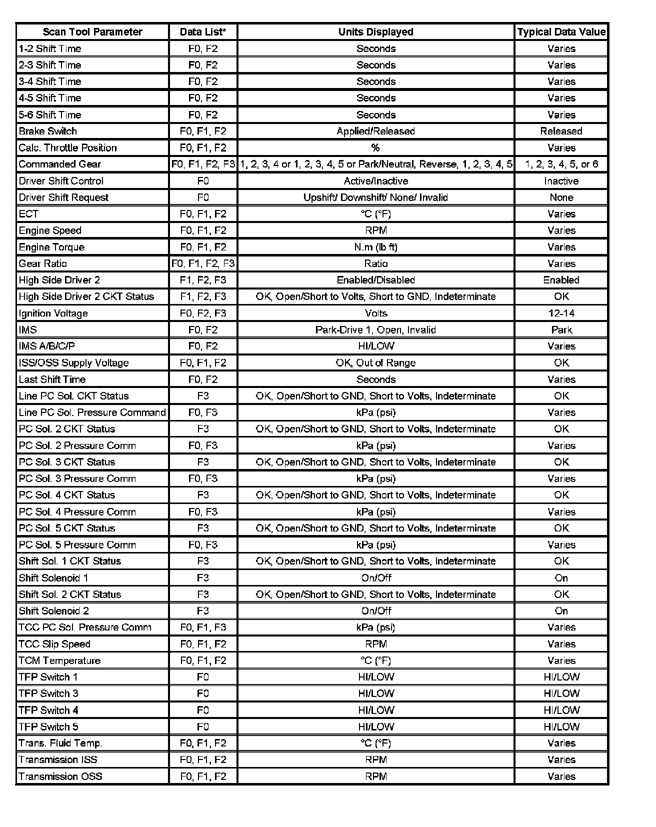 Only the parameters listed below are used in this manual for diagnosing. If a scan tool displays other parameters, the values are not recommended by General Motors for use in diagnosis.