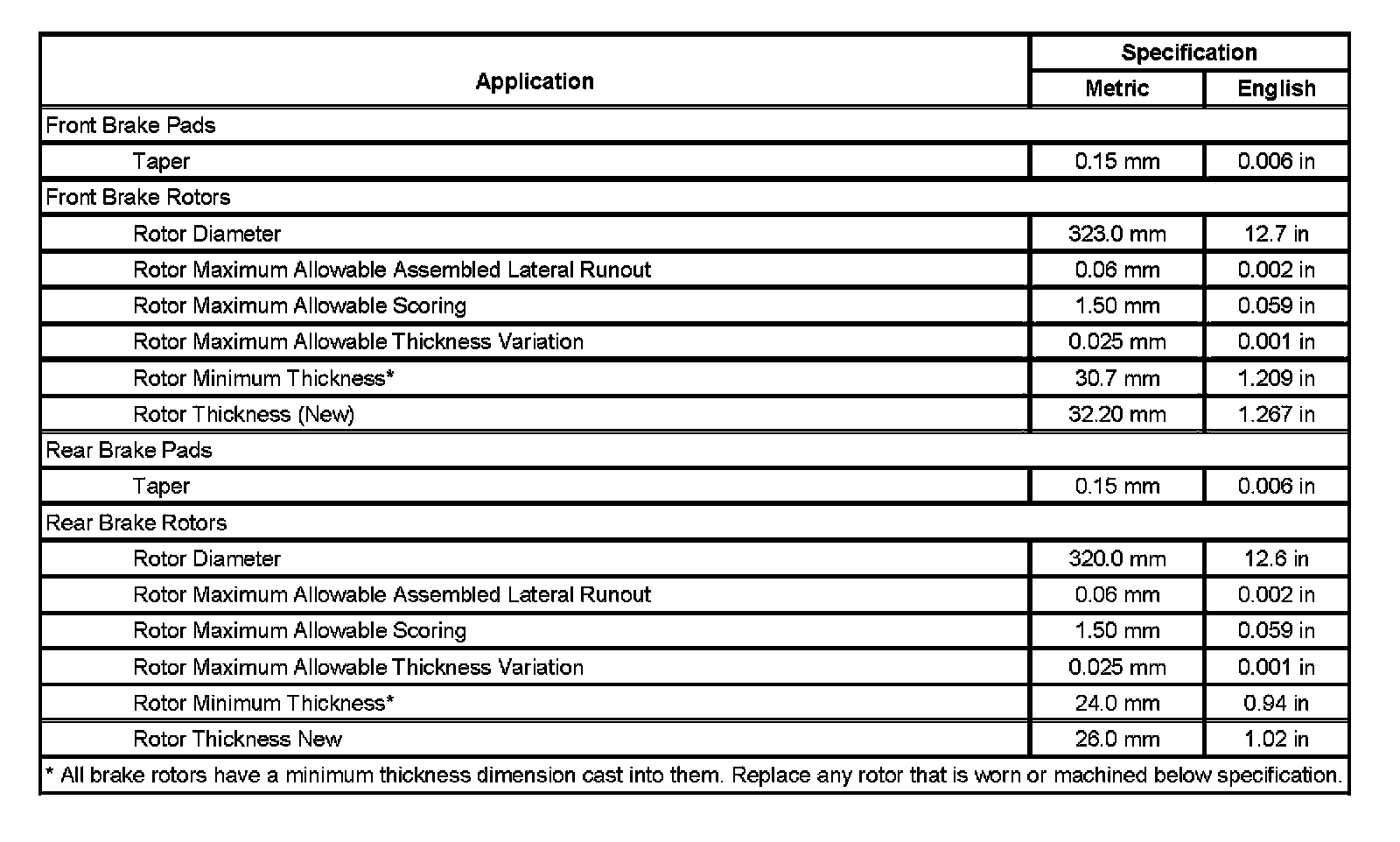 Disc Brake Component Specifications: