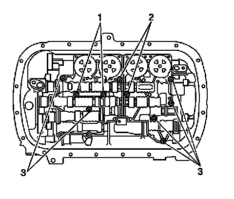 3. Remove ONLY bolts (1, 3) from the valve body assembly. Do NOT remove bolts (2) called out in the graphic.