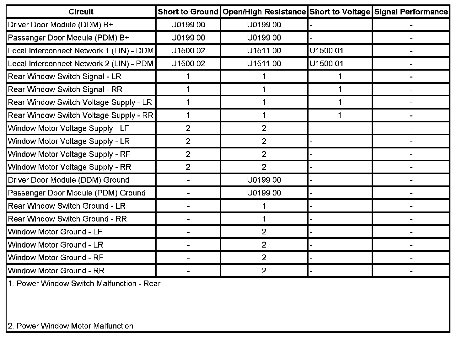 The DDM and PDM supply there respective rear power window switches with a B+ voltage reference and signal circuit. The rear power window switches contain separate resistors for each switch position. When a rear power window switch is activated, the associated door control module interprets the signal and checks for messages from other vehicle control modules prohibiting the window movement. If no prohibitive messages have been received, the door control module sends a LIN serial data message to the appropriate power window motor commanding the requested window position.